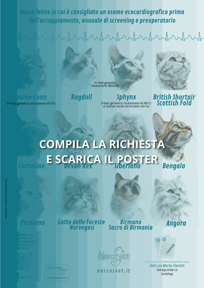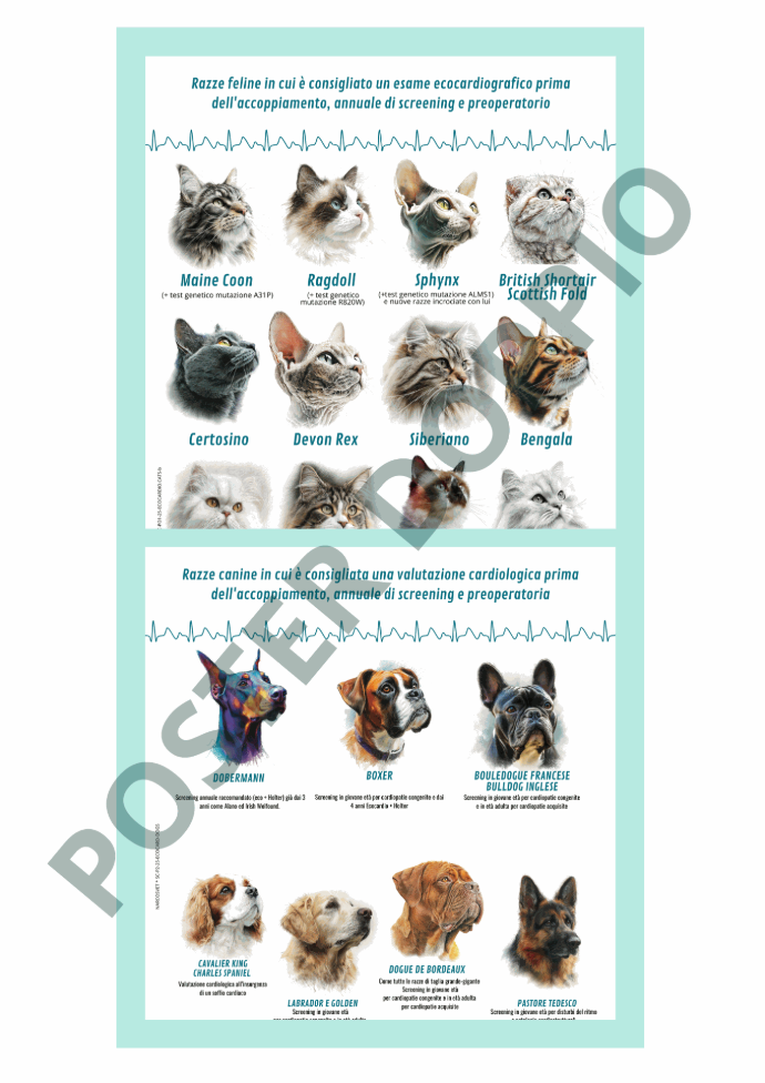 Per diverse razze FELINE, Il poster elenca numerose razze feline, evidenziando l'importanza di test genetici aggiuntivi per mutazioni specifiche che influenzano la salute cardiovascolare, vengono forniti protocolli dettagliati che specificano l'età raccomandata per lo screening di cardiopatie congenite o acquisite.